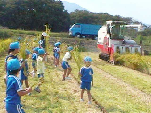 岩間保育園の園児たちが5月に植えた苗が黄金色に実り、それを刈り取って大喜びしていました。