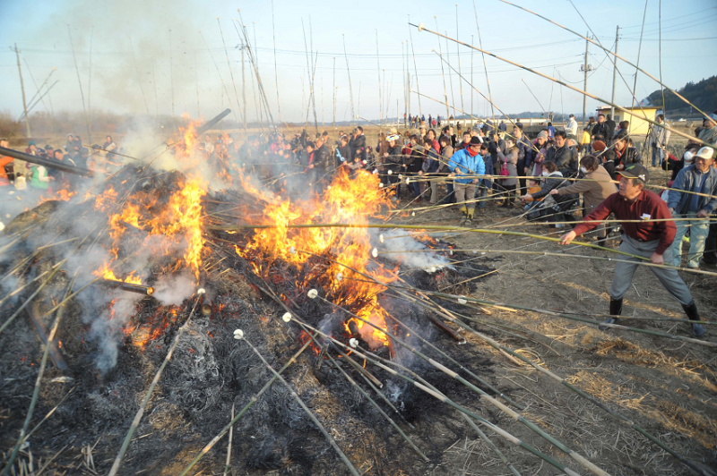 小正月に行う田舎の伝統行事で、田んぼに竹を組んだやぐらを茅で囲い作った小屋に火をつけ、燃やした残り火でもちを焼いて食べ、1年間の無病息災・五穀豊穣を祈る行事です。 来年も開催しますので、是非遊びに来てくださいね!